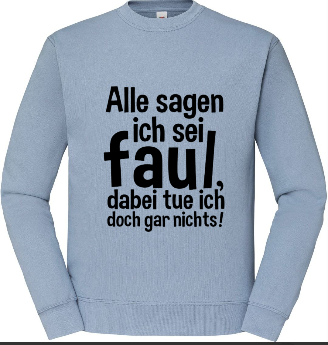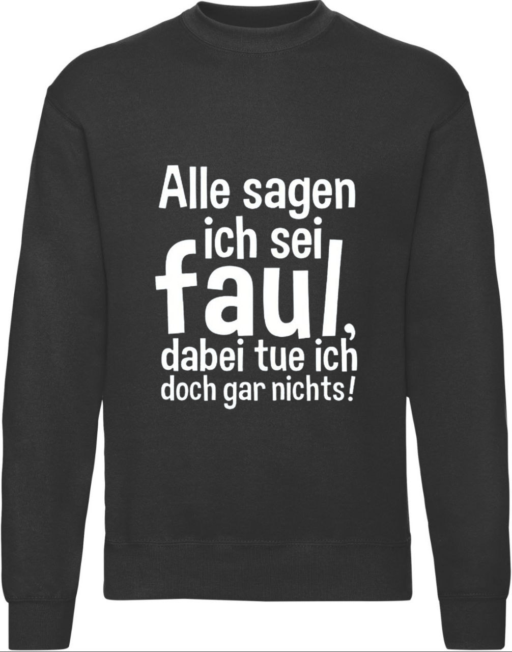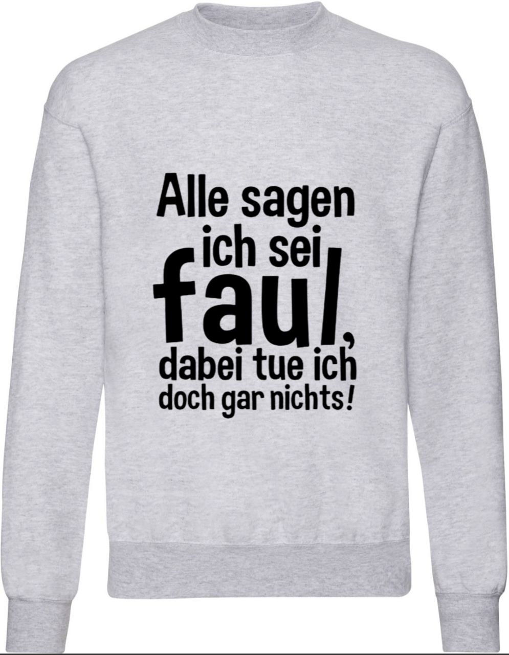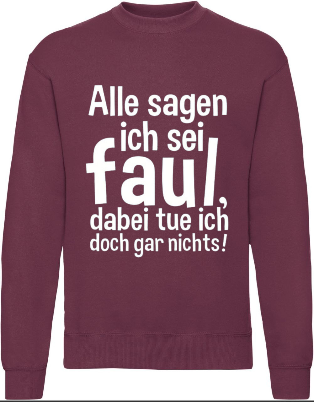 Dieser Sweater ist perfekt für alle, die gerne mit einem Augenzwinkern ihre Faulheit zelebrieren! Mit dem Spruch "Alle sagen ich sei faul, dabei mach ich doch gar nichts" bringst du deine entspannte Einstellung zum Leben auf humorvolle Weise zum Ausdruck. Trage diesen Sweater beim Netflix-Binge-Watching, beim Chillen auf der Couch oder einfach nur beim Nichtstun - er wird dir dabei helfen, deinen Ruf als Meister der Entspannung zu festigen. Zeige der Welt, dass Faulheit eine Kunst ist und du sie perfekt beherrschst. Also schnapp dir diesen Sweater und lass dich von seinem lässigen Style und seiner humorvollen Botschaft umhüllen - denn warum etwas tun, wenn man auch einfach nichts tun kann?