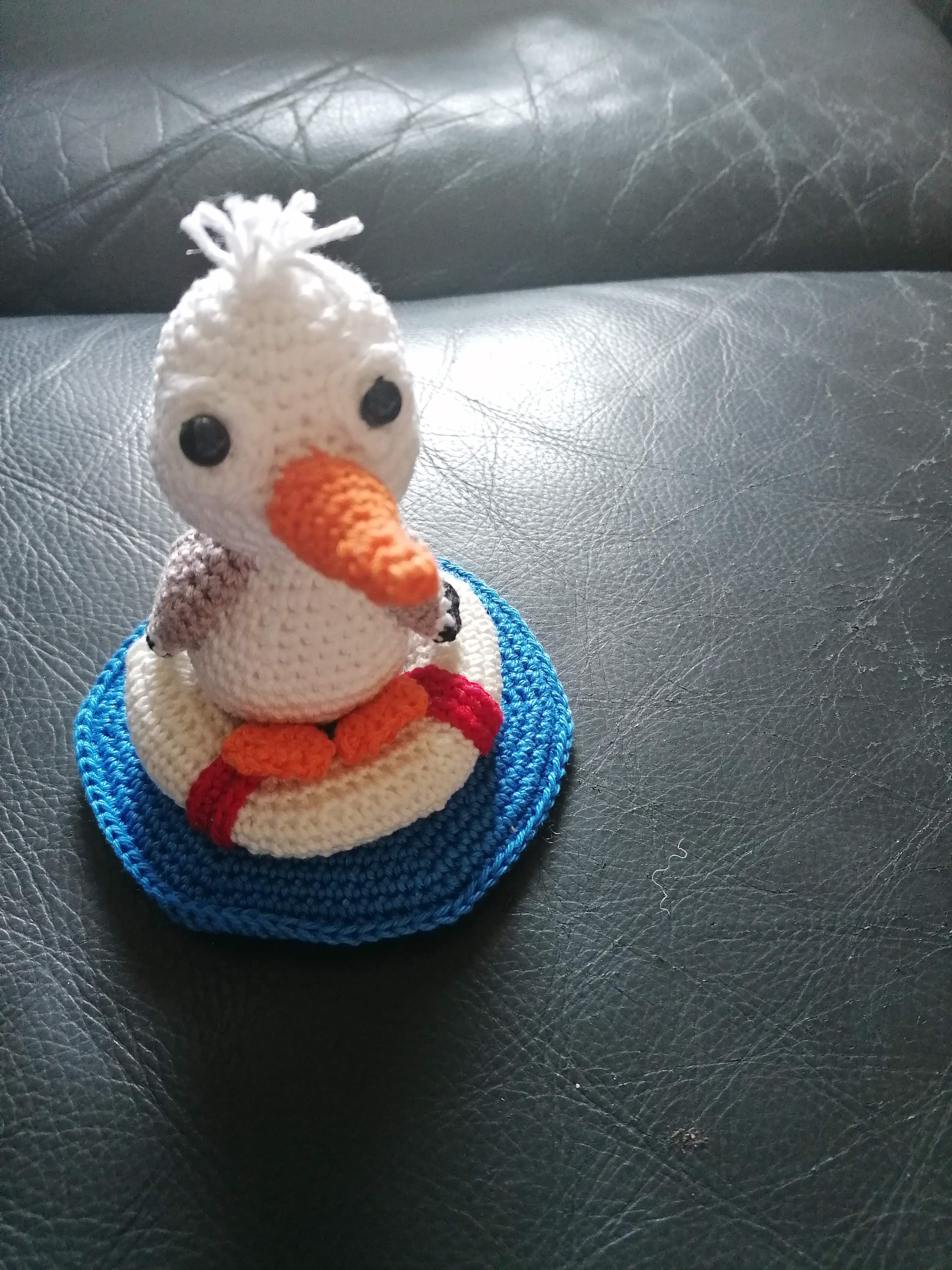 Besonderheit: Sitzt auf einem gehäkelten Rettungsring – fest fixiert auf einem blauen „Wasser“-Sockel