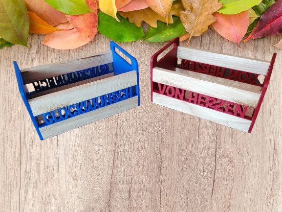 Diese liebevoll gestalteten Holzkörbchen sind nicht nur praktisch, sondern auch ein echter Blickfang. Mit seitlichen Schriftzügen wie