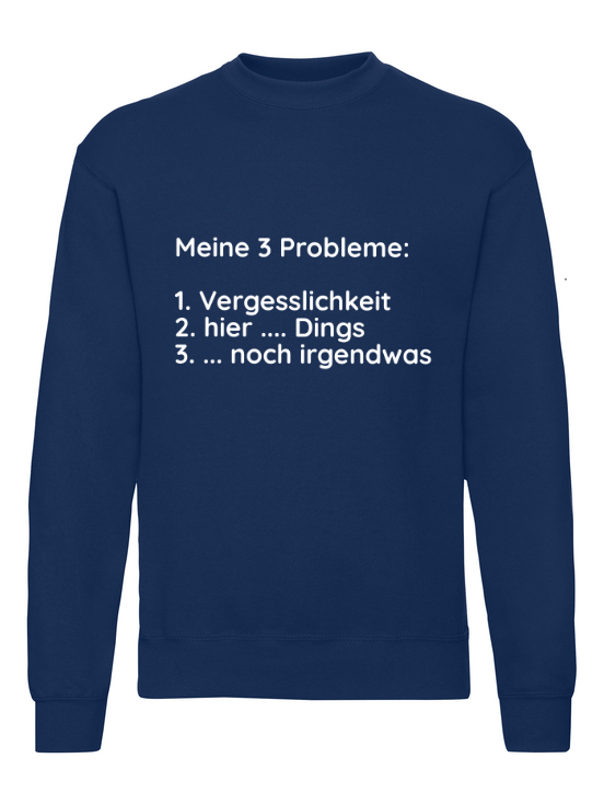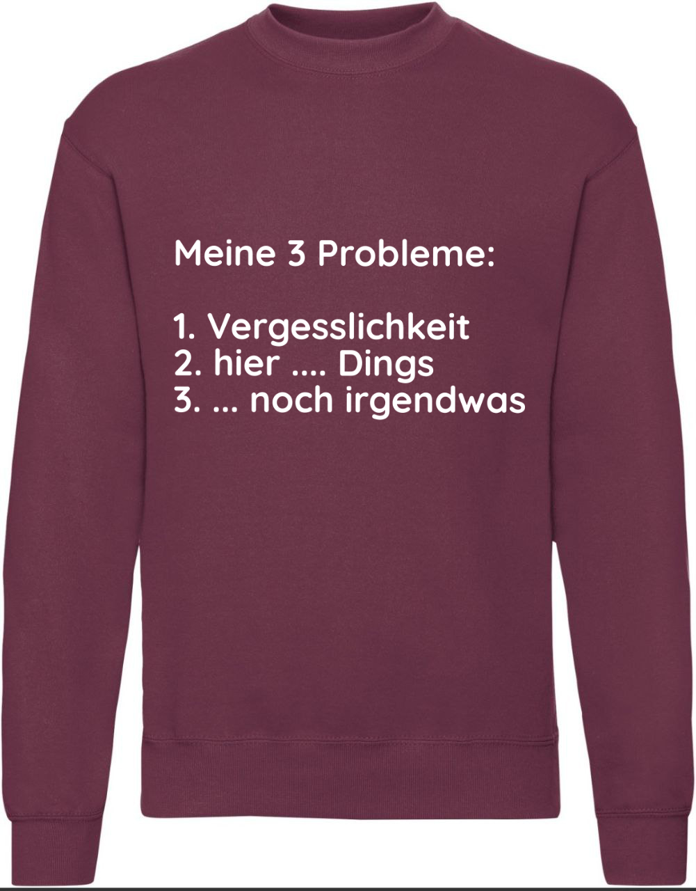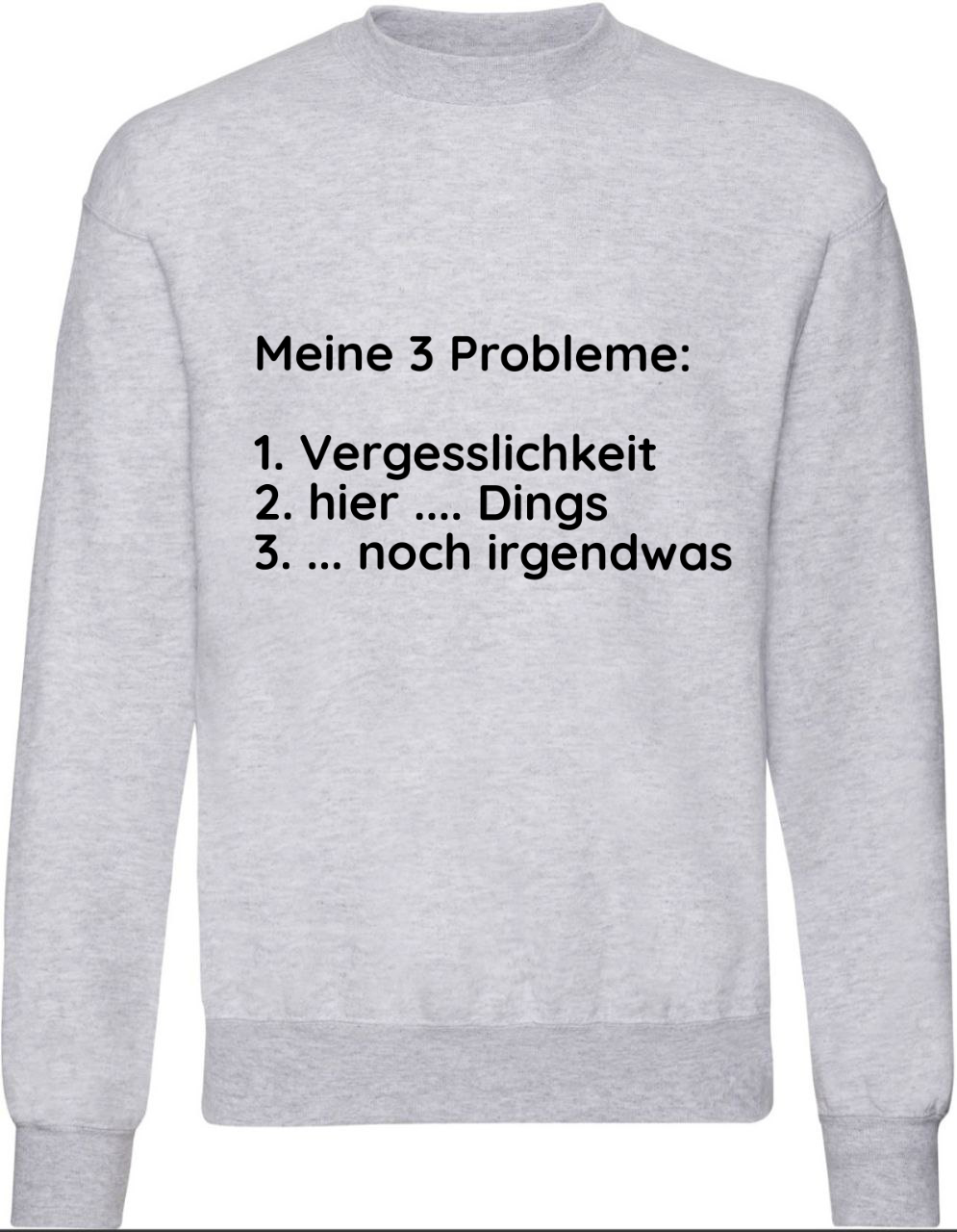 Dieser Sweater ist perfekt für alle, die gerne mit Humor ihre kleinen Schwächen offenbaren! Mit dem Aufdruck "Meine 3 Probleme: 1. Vergesslichkeit 2. hier Dings 3. noch irgendwas" zeigst du der Welt, dass du deine Macken mit einem Augenzwinkern betrachtest. Egal ob du ständig deine Schlüssel verlegst, nie den Namen von Leuten merken kannst oder einfach immer etwas vergisst - dieser Sweater bringt dich und deine lustige Seite zum Strahlen. Trage ihn bei jedem Anlass und sorge für Lacher und gute Laune - denn wer braucht schon Perfektion, wenn man so charmant unvollkommen sein kann? Hol dir diesen Sweater und mach deine kleinen Probleme zu großen Spaßfaktoren!