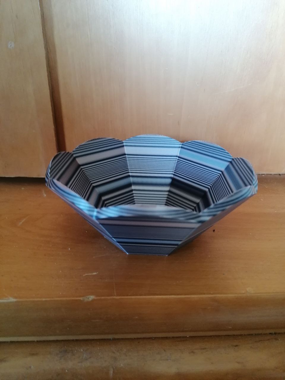Diese dekorative 3D-gedruckte Schale besticht durch ihr modernes, geometrisches Design und die faszinierende Linienstruktur, die durch den mehrfarbigen Filamentdruck entsteht. Die facettierte Form mit sanft gewelltem Rand macht sie zu einem stilvollen Blickfang auf jedem Tisch oder Regal.