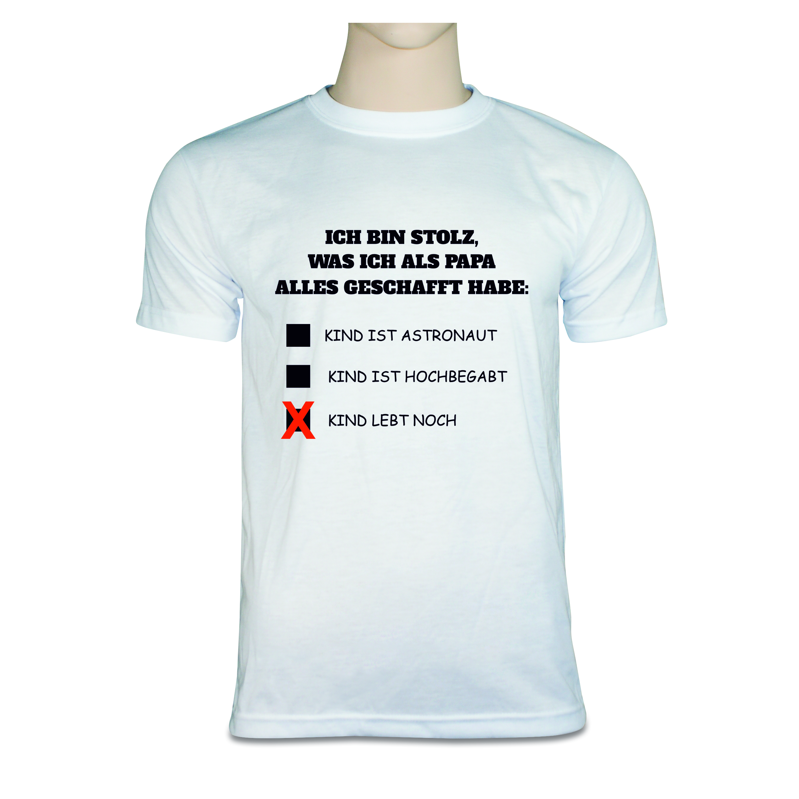 "Dieses T-Shirt ist der Beweis dafür, dass du als Papa wahre Superkräfte besitzt - schließlich lebt dein Kind noch! Mit dem humorvollen Aufdruck 'Was ich als Papa alles geschafft habe - Kind lebt noch' zeigst du der Welt, dass du trotz aller Herausforderungen des Elternseins immer noch den Überblick behältst und deine Mission erfolgreich meisterst. Trage dieses Shirt beim nächsten Elternabend, beim Spielplatzbesuch oder einfach nur zum Lachen - denn wer braucht schon langweilige Shirts, wenn man mit einem so witzigen Statement so viel Aufmerksamkeit erregen kann? Also schnapp dir dieses Shirt, zieh es an und zeige allen, dass du nicht nur ein stolzer Papa bist, sondern auch ein echter Held des Alltags - mit einer gehörigen Portion Humor!"