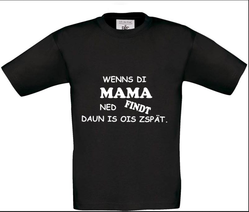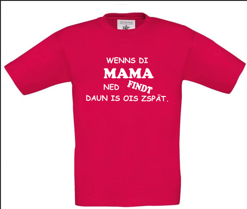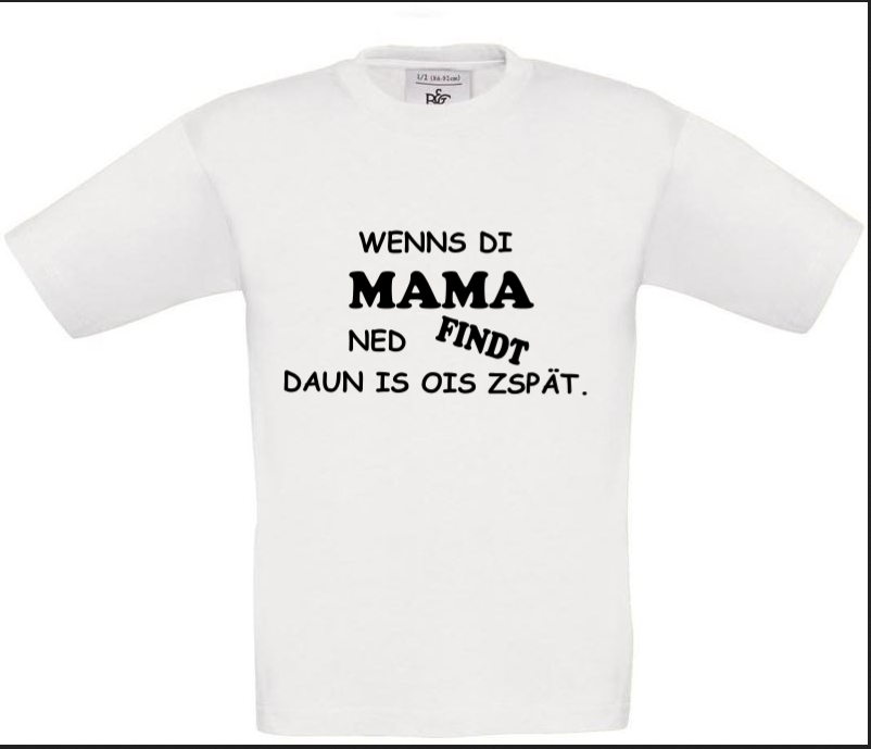 Dieses T-Shirt ist wie ein geheimer Superheld: Wenn die Mama es nicht findet, ist wirklich alles zu spät! Mit dem witzigen Aufdruck "wenns di Mama ned findt, daun is ois zspät" wird dieses Shirt zum ultimativen Retter in der Not. Egal ob beim Versteckspiel im Haus, beim Einkaufen im Supermarkt oder beim Besuch bei Oma und Opa - dieses Shirt erinnert dein Kind daran, dass die Mama immer der beste Detektiv ist. Also schnapp dir dieses Shirt und lass deinen kleinen Helden mit einem Augenzwinkern durch den Tag flitzen - denn wer braucht schon Panik, wenn man die Mama als Geheimwaffe hat?